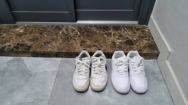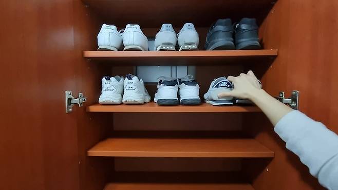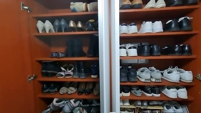 왼쪽 신발장에는 가끔 신는 신발, 오른쪽 신발장에는 자주 신는 신발, 위쪽에는 남편 신발, 그리고 아래쪽에는 엄마와 아이들 신발들을 배치했어요.