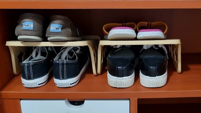 가지고 있던 신발 보관 정리대를 사용해 수납력을 높이고 선반마다 독립적으로 눌리거나 겹쳐진 것 없이