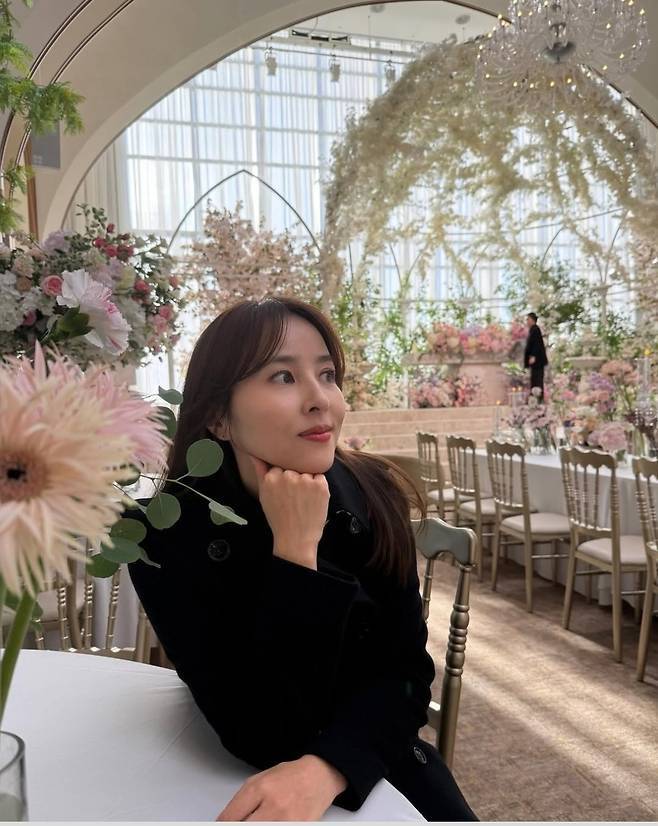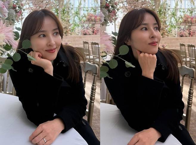 한혜진은 고급스러운 인테리어가 돋보이는 장소에서 블랙 코트를 입고 포즈를 취했습니다.