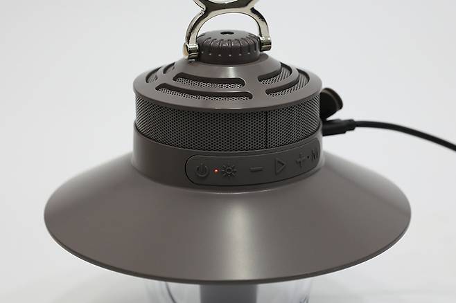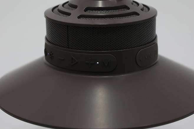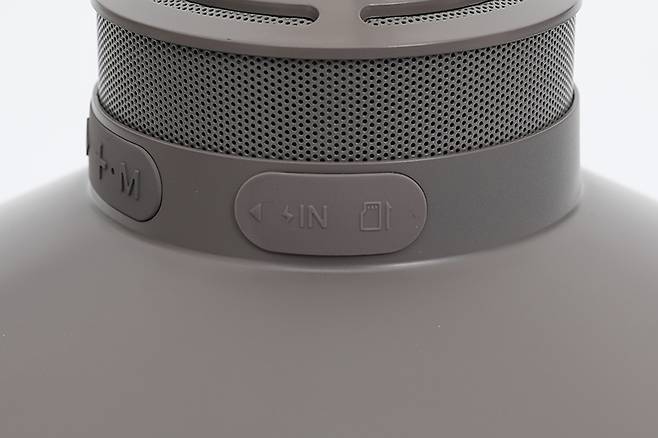 본체 윗부분에는 내장된 스피커 유닛의 그릴이 타공망 형태로 적용되어 있으며, 본체 제일 윗부분에는 본체를 걸어두기 위한 카라비너가 장착되어 있다.