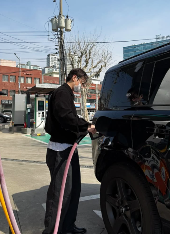 차량에 주유 중인 자연스러운 모습 속에서도 감각적인 패션 센스가 돋보였기 때문.