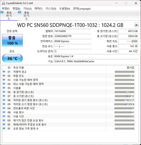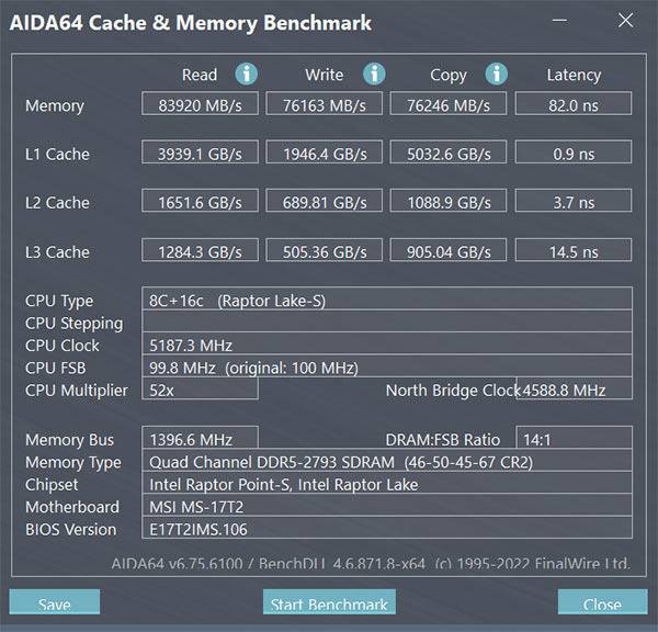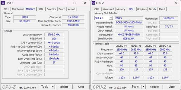 메모리는 DDR5 32GB(16GB * 2)를 탑재하였으며, 최대 96GB까지 인식 가능하다. CPU-Z로 확인한 결과 SK하이닉스 DDR5-5600 (2800MHz) 제품인 걸 알 수 있다. 또한 AIDA64 벤치마크 결과 읽기 속도 83,920MB/s, 쓰기 속도 76,163MB/s, 복사 속도 76,246MB/s에 레이턴시 82.0ns가 기록되었다.