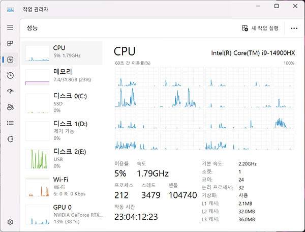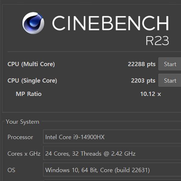 시네벤치 R23 점수는 멀티 코어 22,288점, 싱글 코어 2,203점이다. 이는 인텔 코어 i9-14900HX를 사용하는 노트북에서 준수한 점수다.