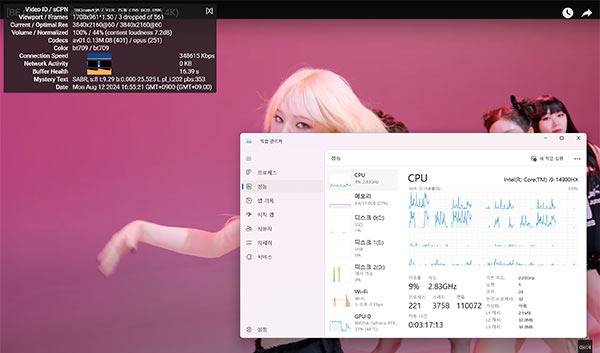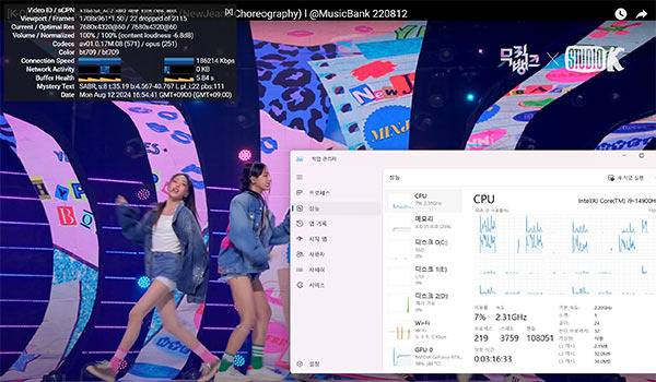 8K와 4K 스트리밍 테스트도 진행하였다. 각각 유튜브를 통해 진행하였으며 동영상 스트리밍에는 CPU 이용률이 각각 9%, 7%를 기록, GPU는 58%와 21%를 기록하며 무리 없이 쾌적하게 시청할 수 있었다.