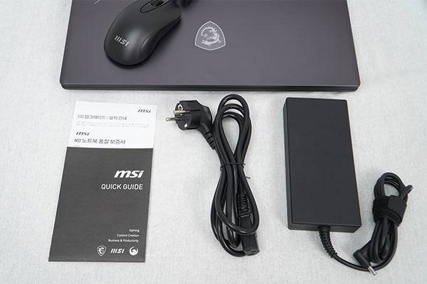 구성품은 MSI 크로스헤어 17 HX D14VGKG-i9 QHD 외에도 17인치 크기 노트북이 들어가는 노트북 백팩, 마우스, 노트북 품질 보증서, 퀵 가이드, 델타 전원 어댑터, 전원 케이블, 노트북 보호 비닐과 내부 보호 부직포가 동봉된다. 마우스는 MSI M88으로 유선 마우스다.
