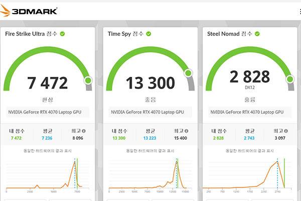 3DMark의 파이어 스트라이크 울트라, 타임 스파이, 그리고 스틸 노마드를 통해 GPU 벤치마크 역시 진행하였는데 각각 7,472점, 13,300점, 2,828점으로 게이밍 노트북에 걸맞는 점수를 보여줬다.
