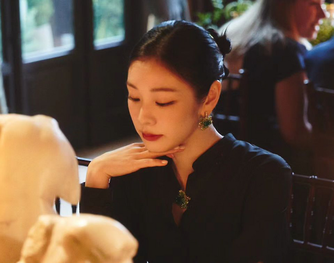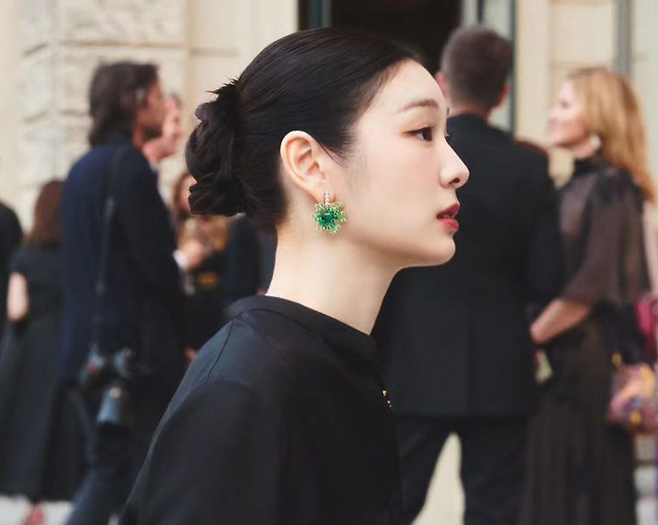 김연아는 단아한 올림머리 헤어스타일에 우아한 검은색 롱 드레스를 입고 초록색 귀걸이와 목걸이 등으로 포인트를 줬는데요.
