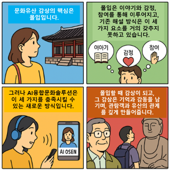 이 문장은 K-컬처 감상의 패러다임이 ‘기록’에서 ‘경험’으로 전환되어야 한다는 메시지를 담고 있다. 기존의 입간판, 오디오 가이드, 텍스트 설명은 사실의 나열에는 유용하지만 감정의 공감과 기억의 각인에는 한계가 지닌다. 특히 디지털 환경에 익숙한 Z세대·알파세대, 그리고 언어 장벽을 지닌 외국인 관람객에게는 더욱 취약하다.