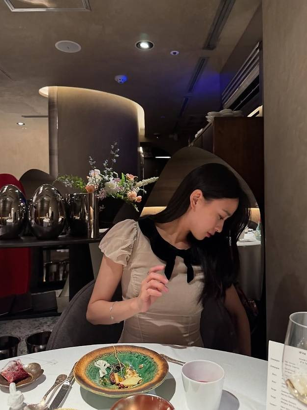 또 다른 사진에서 손연재는 크림빛 원피스에 검은 벨벳 칼라 디테일이 돋보이는 드레스를 착용해 고급스러운 분위기를 연출했습니다.