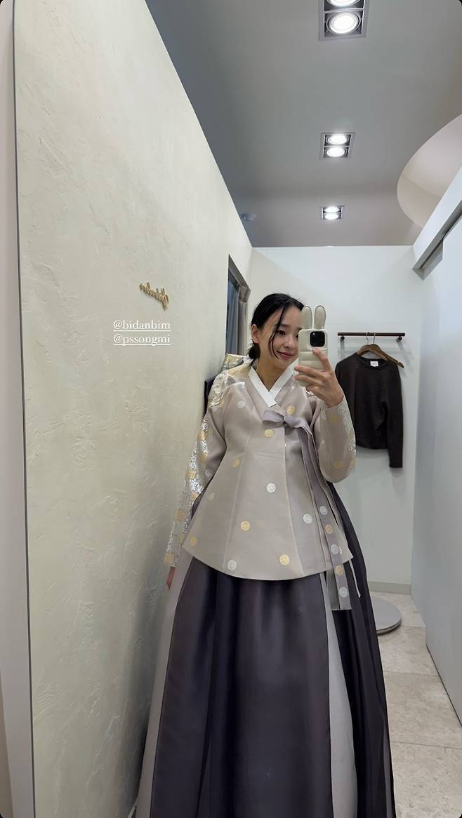 손연재는 고급스러운 은빛 바탕에 금박 도트가 장식된 한복 저고리와 은은한 남색 치마를 매치하며 단아한 한국미를 뽐냈습니다.