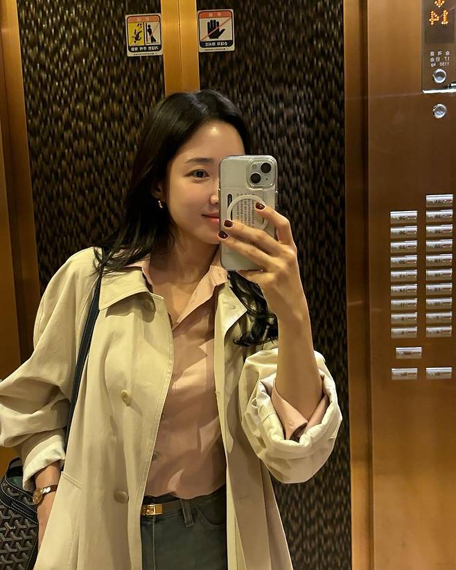 또 다른 사진에서는 핑크 컬러의 셔츠를 입고 청바지와 베이지컬러의 트렌치자켓을 입어 가을무드가 물씬 풍기는 스타일링을 선보였다.