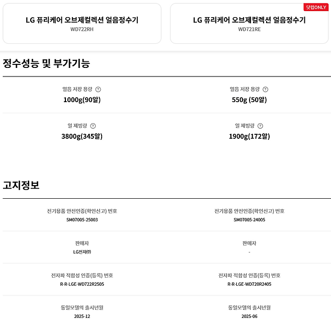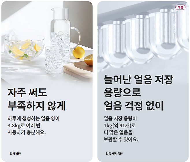 사실 전문 제빙기와 비교하면 정수기라는 체급의 한계는 여전히 존재한다. 실제로 LG 퓨리케어 오브제컬렉션 얼음정수기가 2024년 첫 출시될 당시 ‘직수+제빙+냉동보관’이라는 신박한 구조로 기대를 모았지만, 초기엔 얼음이 나오는 속도가 느리거나 보관량이 적다는 불만이 꽤 있었다.