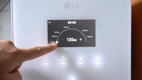요즘 어지간한 신제품 정수기는 대부분 물 온도나 용량을 선택해서 뽑을 수 있다. 그런데 보통은 온도/용량 모두 사전에 설정된 몇 개의 구간 중에서 하나를 선택하는 방식이다. 이러면 내가 정확히 원하는 온도/용량을 선택하려고 몇 번을 눌러야 해서 귀찮을 때가 있고, 사전 설정값을 벗어나는 완전한 커스텀은 안 되는 아쉬움이 있다. 하지만 이 제품은 완전한 커스텀이 가능하다.