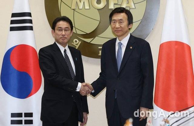 | 2015년 12월 일본군(軍) 위안부 문제 담판을 위해 한국을 찾은 기시다 후미오 당시 외무상(왼쪽)이 윤병세 외교부장관과 악수하는 모습. 동아일보DB |