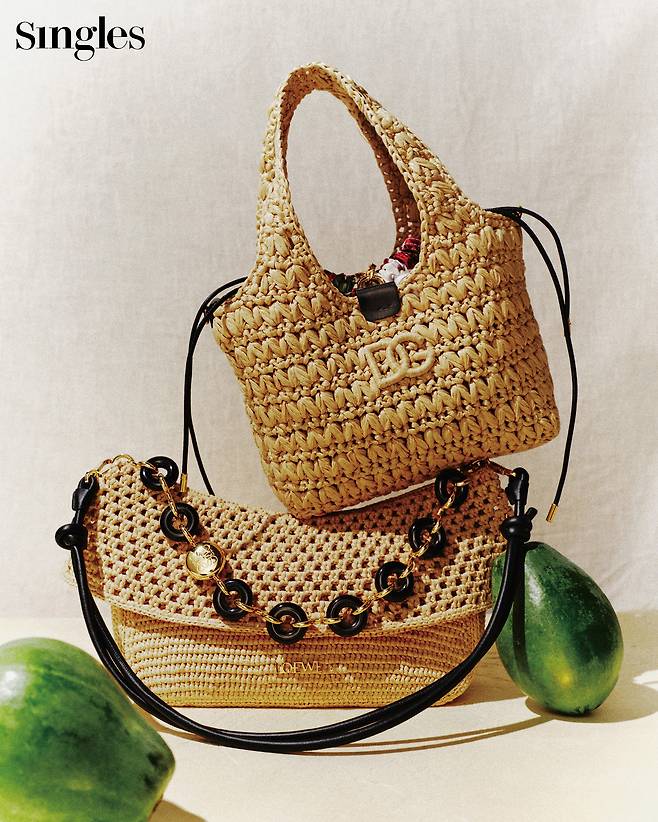 라피아와 트윌 소재로 제작한 쇼퍼백은 330만원 Dolce&Gabbana, 도넛 체인 스트랩을 단 숄더백은 290만원 Loewe.