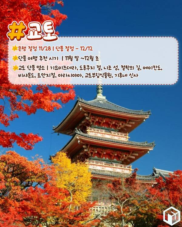 교토 단풍 추천 명소로는 기요미즈데라, 도후쿠지 절, 니조 성, 철학의 길, 에이칸도, 비샤몬도, 료안지절, 아라시야마, 교토부립식물원, 기후네 신사를 추천드립니다.