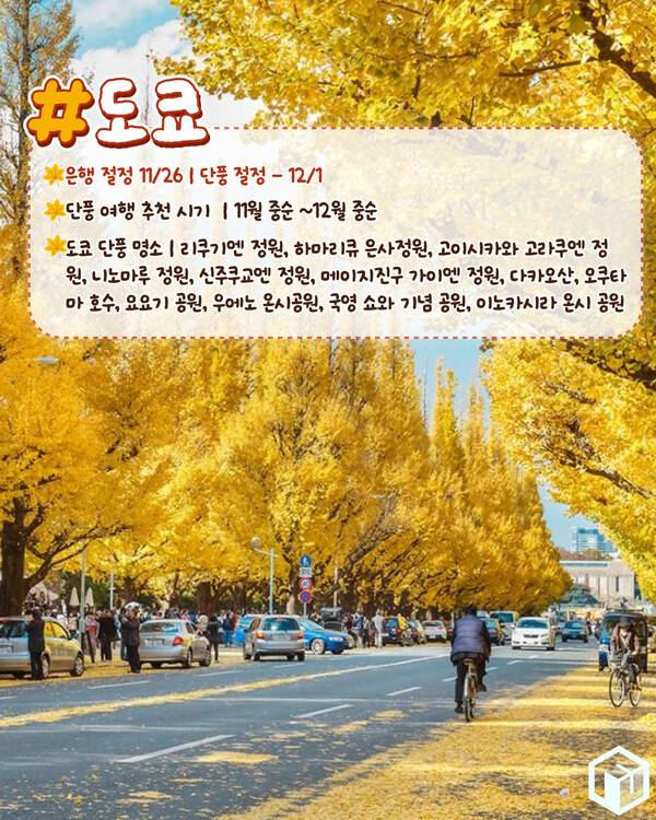 일본의 수도이자 도심 속 단풍이 아름다운 도쿄의 단풍 절정시기는 12월 1일로 11월 중순부터 12월 중순까지 환상적인 단풍을 만나보실 수 있어 겨울이 오기 전 가을의 도쿄를 가장 완연하게 즐기기 좋은 시기입니다.