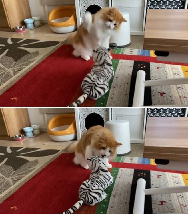 바로 하양이와 꼭 닮은 백호랑이 인형이었습니다. 크기도 비슷하고 줄무늬도 고양이와 참 닮아 있었죠. 평범한 인형 선물에 그저 그런 반응을 기대했는데, 그날 하양이의 반응은 예상 밖이었습니다.