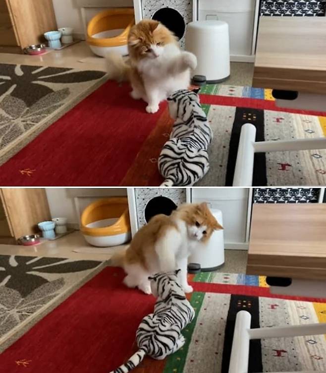놀라운 건, 인형이 당연히 아무 반응도 보이지 않자 하양이가 오히려 당황한 듯 멈칫하더라는 거예요. 그렇게 한참을 바라보다 인형에게 다가가 코를 킁킁대며 냄새를 맡기 시작했습니다.