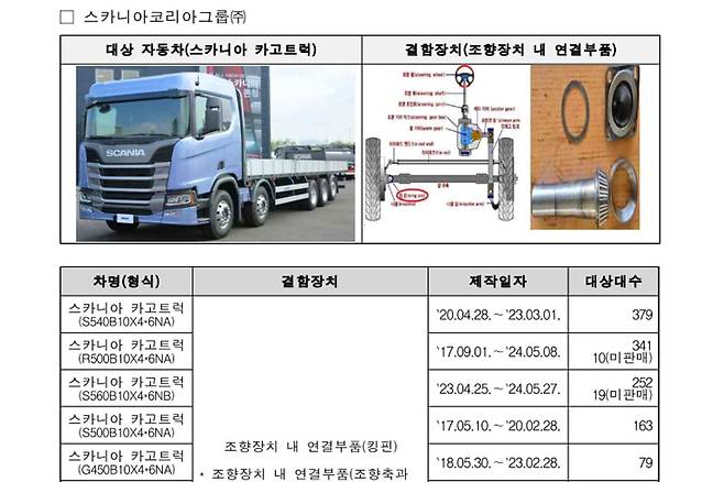 또한, 스카니아코리아그룹의 스카니아 카고트럭(1,274대)은 조향장치 부품 불량으로 핸들 떨림 현상이 발생할 가능성이 확인되었으며, 오는 27일부터 리콜 조치가 시작된다.