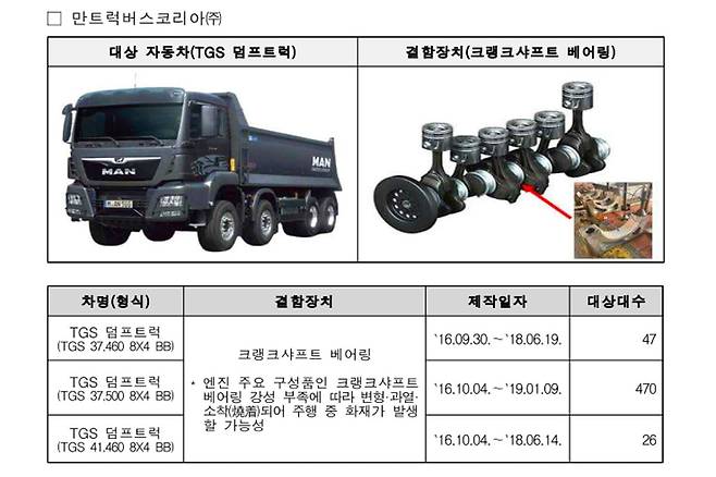상용차 부문에서는 만트럭버스코리아의 TGS 덤프트럭을 포함한 4개 차종(1,829대)에서 크랭크샤프트 메인베어링의 강성 부족으로 화재 위험이 발견되었으며, 이는 다음달 4일부터 리콜이 진행된다.