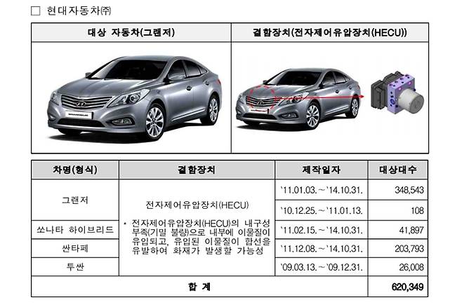 특히 그랜저(62만 349대)와 싼타페(20만 3,793대)는 전자제어유압장치(HECU)의 내구성 부족으로 인해 화재 위험이 제기되었다.
