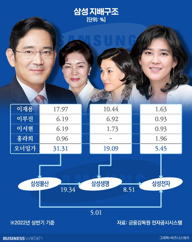 현재 삼성그룹의 지배구조는 이 회장을 포함한 오너일가가 지배하고 있는 삼성물산부터 삼성생명, 삼성전자로 이어진다.