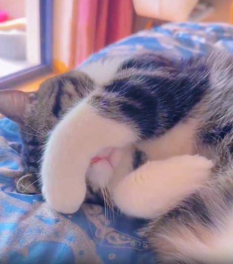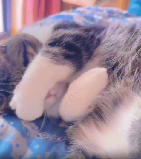 그 자세를 유지한 채 고양이는 한참을 꼼짝하지 않았습니다. 몸은 편안하게 늘어져 있지만, 살짝 접힌 귀와 몸 쪽으로 살짝 움츠린 어깨선이 은근한 수줍음을 드러냅니다. 이 모습에 사람들은 미소를 머금게 되죠. 도대체 얼마나 사랑스러우면 ‘부끄러워하는 고양이’라는 말이 어울릴까요?