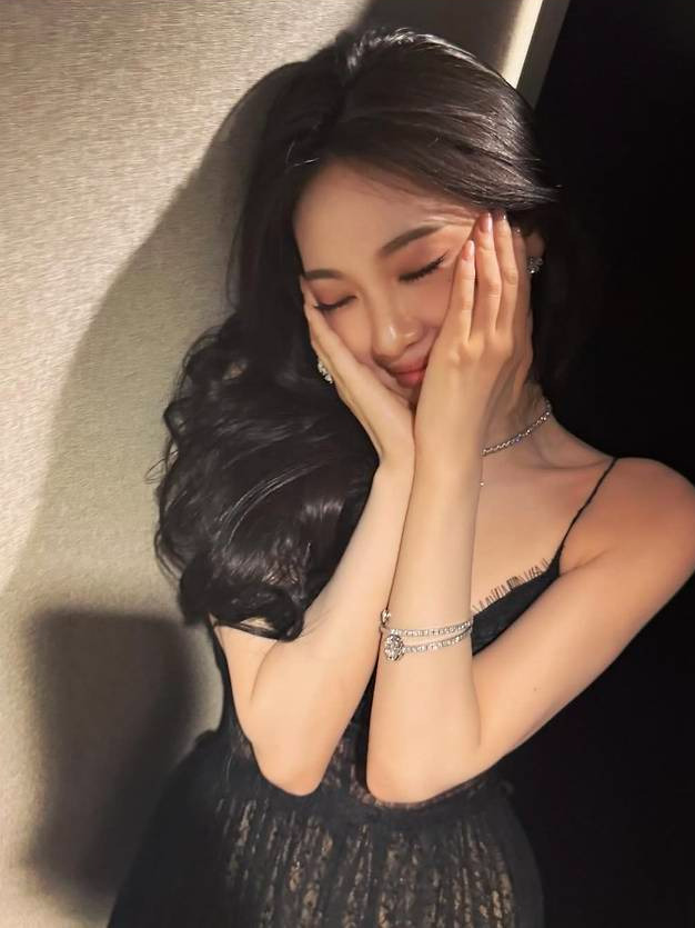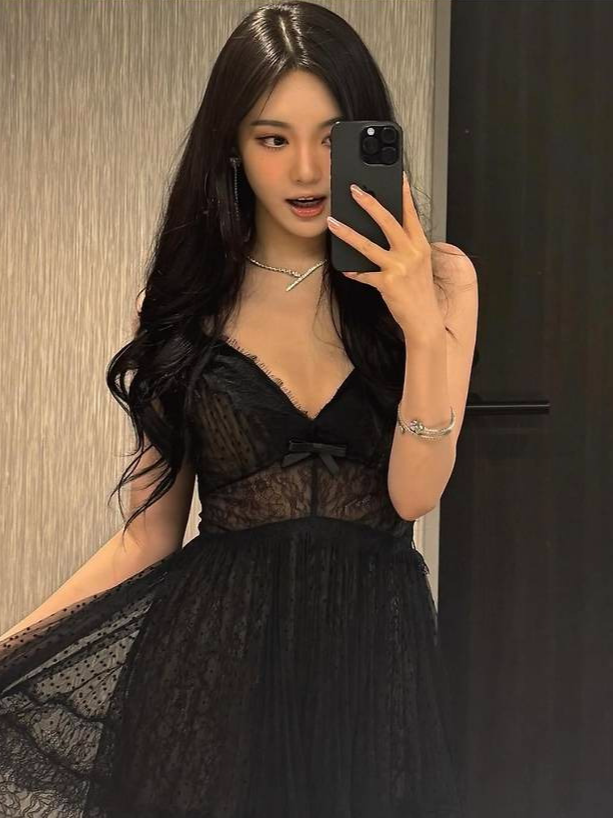 특히 레이스 디테일과 도트 망사로 마무리된 드레스 밑단은 로맨틱하면서도 관능적인 실루엣을 완성해 시선을 집중시켰습니다.
