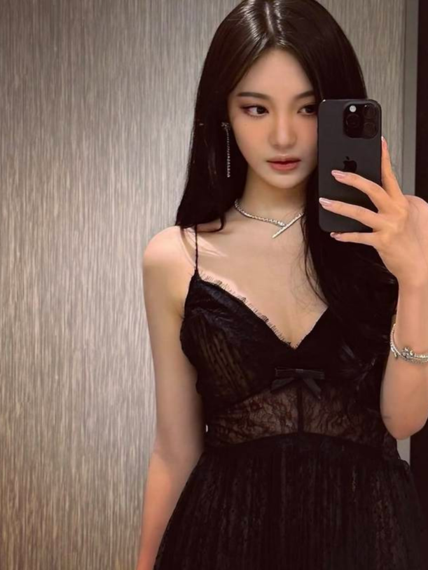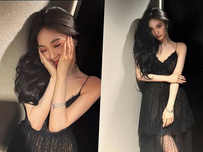 얇은 끈이 돋보이는 시스루 원피스로 고혹미를 더했습니다.