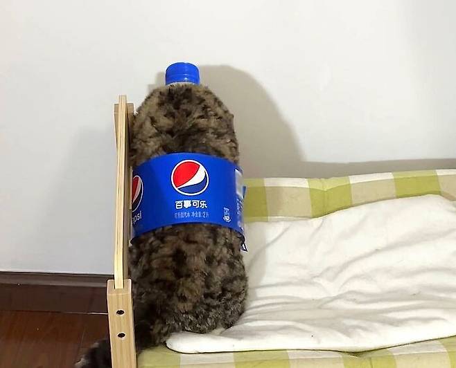 여기서 끝이 아니었습니다. 파란 병뚜껑을 머리 위에 올려놓는 순간, 이 고양이는 완벽한 펩시 페트병으로 변신하고 말았는데요.