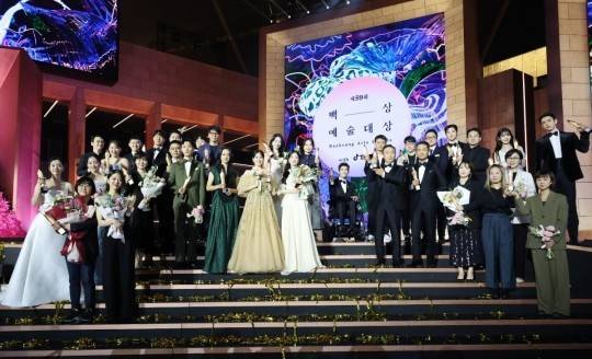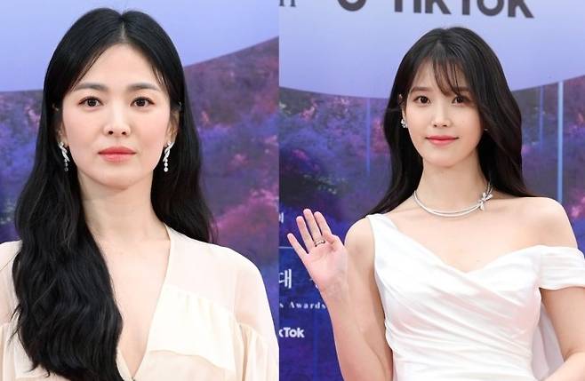 이후 송혜교가 아이유에게 간식 차를 선물하기도 하며 친분을 이어가고 있는 듯한 모습을 보이기도 했습니다. 배우 감독들과 인사를 나누던 아이유는 조금씩 자리를 이동하더니 맨 가장자리로 이동해 함께 인기상을 수상한 박진영 옆에 서서 사진을 찍었습니다.