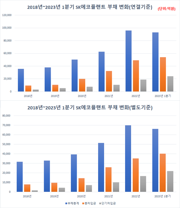 자회사를 제외한 SK에코플랜트만의 재무건전성 지표는 더욱 좋지 않다. 사세를 확장하는 과정에서 비용이 크게 소요된 탓이다. 올해 1분기 별도기준 SK에코플랜트의 부채총계는 6조6193억원으로 2018년(3조1663억원) 대비 2배 가량 늘었다. 같은 기간 총차입금은 4조239억원으로 5.1배 증가했다. 차입금 가운데 1년 안에 갚아야 하는 단기차입금이 2조1840억원으로 절반을 웃돈다.