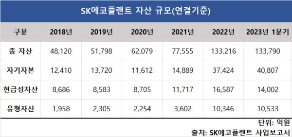 사업 포트폴리오가 쌓여가는 동안 SK에코플랜트의 규모를 드러내는 주요 재무적 지표도 확연히 달라졌다. 먼저 총 자산(연결기준)은 2018년 4조8210억원에서 올해 1분기 13조3790억원으로 약 2.8배 불어났다. 같은 기간 현금성자산은 8986억원에서 1조4002억원으로 1.6배 늘었으며, 1958억원이었던 유형자산은 1조533억원으로 5.4배 증가했다.
