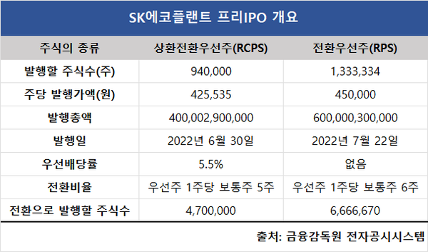 SK에코플랜트의 재무건전성을 개선해준 프리IPO에도 옥의 티가 있다. 1조원 가운데 4000억원이 상환전환우선주(RCPS) 발행으로 이뤄졌다는 점이다.