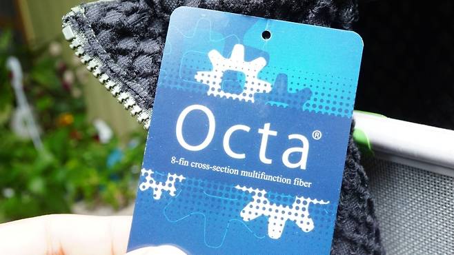 가장 큰 특징은 기존 SOLOTEX의 단면 형상을 바꾸어 놓은 것입니다. 그렇게해서 8각형 모양의SOLOTEX OCTA를 내놓습니다. 현미경 사진을 보면8개의 돌기가 있는 모양이라 Octa라는 이름이 붙었나 봅니다. 기왕에 현미경 사진을 본 김에 자세히 보면 가운데 구멍이 뚫려있습니다. 이걸 어려운 말로는 가운데가 비어있다고 해서 중공사, 중공섬유라고 합니다. 중국하고는 상관 없어요. 이렇게 텅 비어있는 중공사는 그 안에 공기가 들어가서 가볍지만 따뜻하다는 것이죠. 원래 이 섬유가 스트레치성, 형태회복성, 완충성이 좋았는데 Octa구조로 만들어 더욱 가벼워졌다고 합니다. 거듭 말하지만 가볍고 따뜻합니다. 그게 이 섬유의 특징이며, 이 옷 역시 그런 특징이 있습니다. 얇고 가벼운데 따뜻하다 이게 핵심입니다.