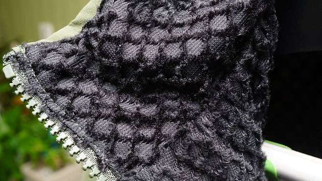 자세히 보면 검정천이 뭔가 그물처럼 되어 있습니다. 이 그물처럼 보이는 안감이 바로 보온을 담당하는 일종의 솜입니다. Teijin이라는 회사에서 개발한 제품으로 Strech Octa라는 소재입니다. 참고로 이 소재는 아크테릭스 프로톤LT에도 쓰이는 소재입니다. 물론 프로톤LT는 이렇게 보온재가 노출되어 있지는 않습니다.