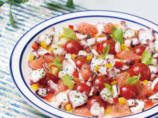 재료: 자숙 문어 다리 200g, 방울토마토 10개, 노랑·빨강 파프리카 1/4개씩, 양파 1/4개, 자몽 5쪽, 생파슬리 약간