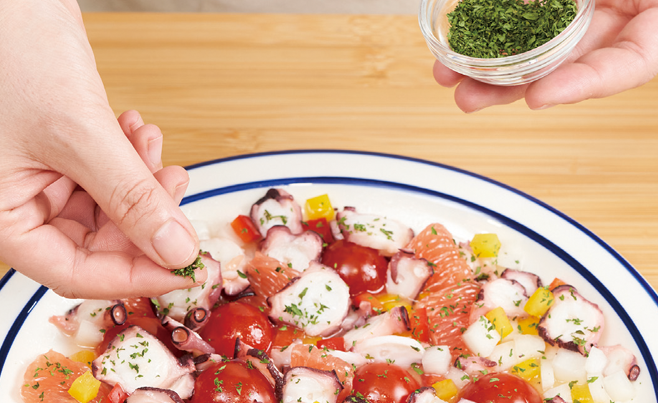 2) 문어는 동그랗고 얇게, 방울토마토는 반으로, 나머지 채소는 사방 0.8cm 크기 큐브 모양으로 자르고 파슬리는 다진다.