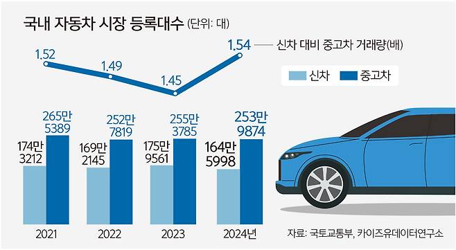 국토교통부와 카이즈유데이터연구소에 따르면 지난해 국내에서 판매된 중고차는 253만9874대로, 같은 기간 판매된 신차(164만5998대) 대비 1.54배 많은 거래량을 나타냈다. 신차 대비 중고차 거래량은 2021년 1.52배, 2022년 1.49배, 2023년 1.45배로 점차 줄어들다가 지난해 반등했다.