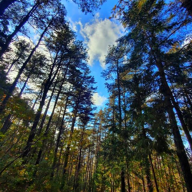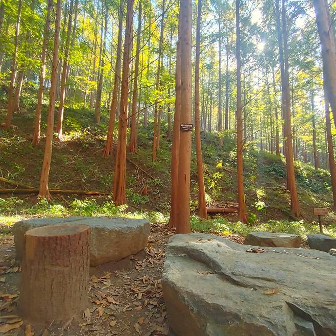 가끔은 메타세쿼이아 사이로 작은 새들이 날아들고, 바람이 불면 편백 잎에서 은은한 향이 흘러나옵니다. 정상 부근에는 쉼터가 마련되어 있어 잠시 앉아 숨을 고르며 하늘을 올려다보면 숲 사이로 새어드는 햇살이 반짝이며 눈부십니다. 가을에는 단풍이 스며들고, 여름에는 초록이 짙습니다. 겨울에도 낙엽송과 삼나무 덕분에 숲의 기운은 여전히 따뜻하게 살아 있습니다.