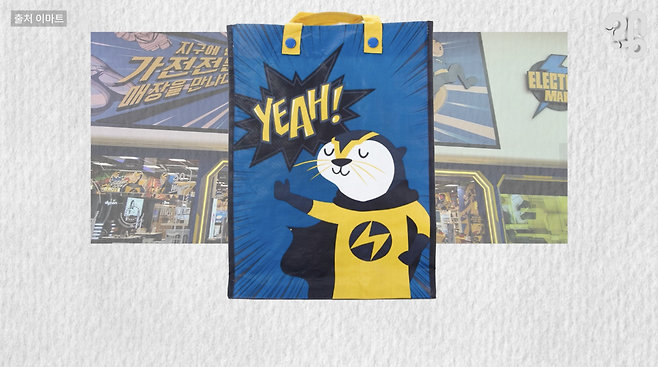 이 가방이 어찌나 인기가 많은 지, 전통시장에서도 이 장바구니를 쓰기도 하고, 펭수랑 콜라보도 하고, 일렉트로마트 초창기에 한정판 ‘일렉수달’ 가방도 나왔고, 심지어 다른 브랜드의 편의점에서 발견되기도 한다.