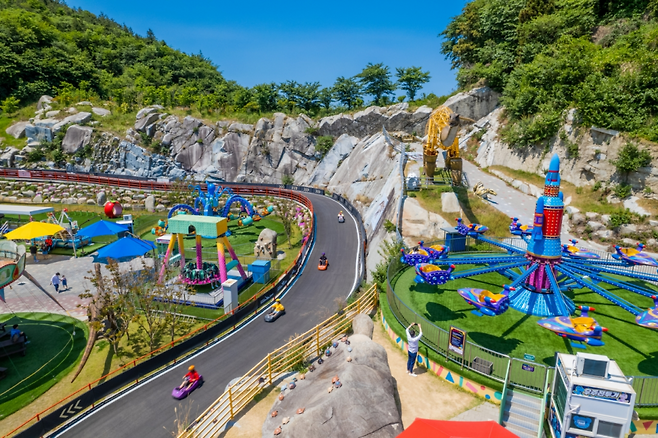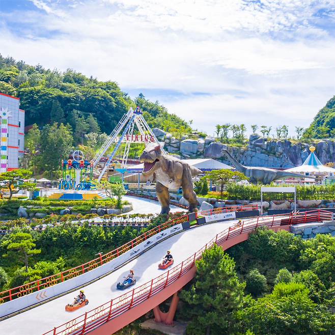 여수에 도착하자마자 가장 먼저 향한 곳은 ‘여수 유월드 루지 테마파크’. 이곳은 단순한 루지장 그 이상이에요. 여름에도 바람을 맞으며 시원하게 즐길 수 있는 루지 외에도, 테디베어뮤지엄, 쥬라기어드벤처, 레이저아레나, 놀이공원 등 다양한 체험 콘텐츠가 모여 있는 여수 대표 복합 놀이터예요.