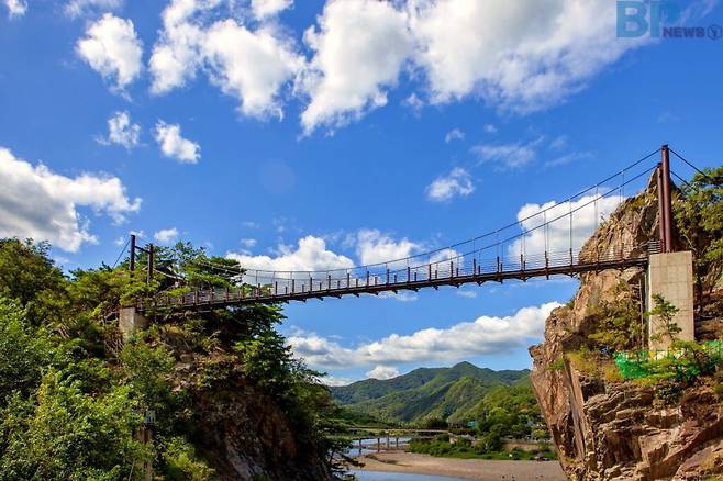 이 칼바위 능선을 가로지르는 112m 길이의 출렁다리는 수주팔봉의 대표적인 명소다. 철 구조물로 튼튼하게 설계된 이 다리는 계곡 위를 걷는 듯한 스릴을 제공하며 다리 중간에 서면 달천과 팔봉마을이 내려다보이는 압도적인 전망이 펼쳐진다.