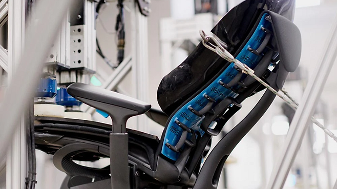 하지만 허먼밀러를 대표하는 의자는 '에어론' 만이 아닙니다. '엠바디'도 있죠. 두 제품 다 장기간 의자에 앉아 있는 이들을 위해 오랜 연구를 거쳐 탄생한 의자이지만, 세부적인 설계에서 차이가 납니다. 에어론이 특수 탄성 소재로 통기성을 높이고 허리를 중점으로 지지한다면, 엠바디는 척추 모양으로 디자인된 등받이를 통해 허리부터 등까지 안정적으로 받쳐주죠.