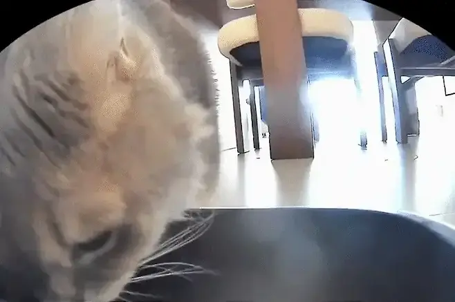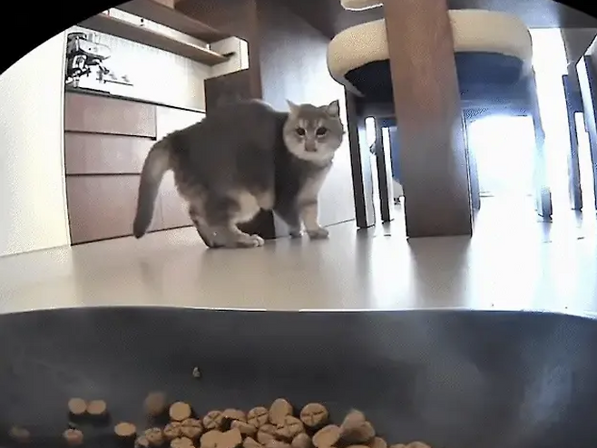 갑자기 급식기에서 사료가 쏟아져 나오자, 고양이는 깜짝 놀랐습니다. 동그래진 눈, 곤두선 털로 마치 무서운 유령이라도 본 듯 황급히 몇 발짝 뒤로 물러섰습니다.