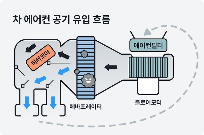 차량 에어컨 작동 시에 퀴퀴한 냄새가 났었던 경험이 있으신가요? 이런 냄새는 에어컨 필터나 공조기 라인에서 증식한 세균과 곰팡이로 인해 실내로 유입되는 경우가 많습니다. 여름철에는 에어컨 작동 시 실외와 온도차로 인해 결로(물기)가 발생하기 쉽기 때문에 더욱 관리해 주어야 하는데요.