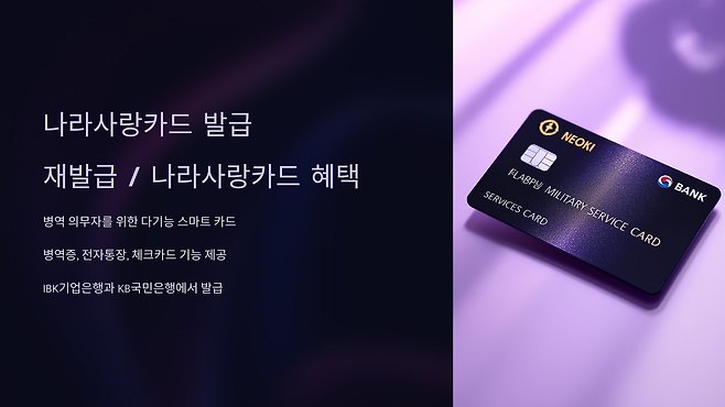 나라사랑카드는 병역 의무자를 위한 다기능 스마트 카드로, 병역증, 전자통장, 현금카드, 체크카드 기능은 물론 다양한 할인 및 우대 혜택을 제공합니다. 2007년 이후 병역판정검사를 받은 만 18세 이상의 남성이라면 누구나 발급받을 수 있습니다. IBK기업은행과 KB국민은행 두 곳에서 발급하며, 각 은행별로 약간의 혜택 차이가 있을 수 있습니다.