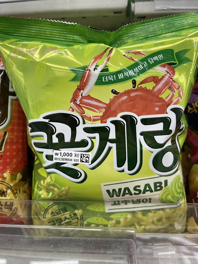 국민과자인 꽃게랑에 고추냉이(와사비) 시즈닝을 입힌 매콤스낵으로 기존 꽃게랑의 바삭바삭한 입체형 스낵 구조는 그대로 유지했어요.