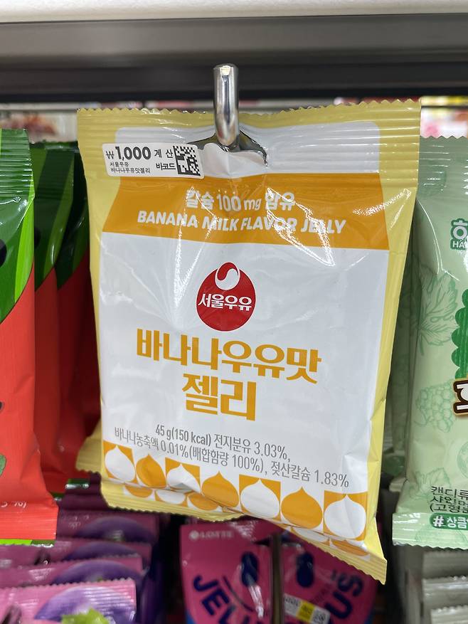 서울우유 바나나우유 맛을 그대로 젤리로 만든 제품으로 바나나우유 킬러인 아이들이 좋아해요.